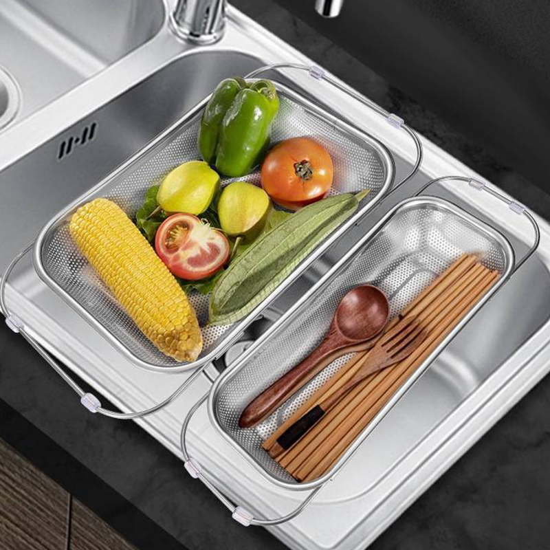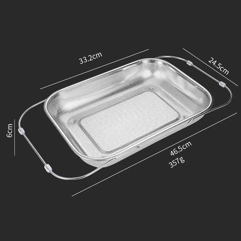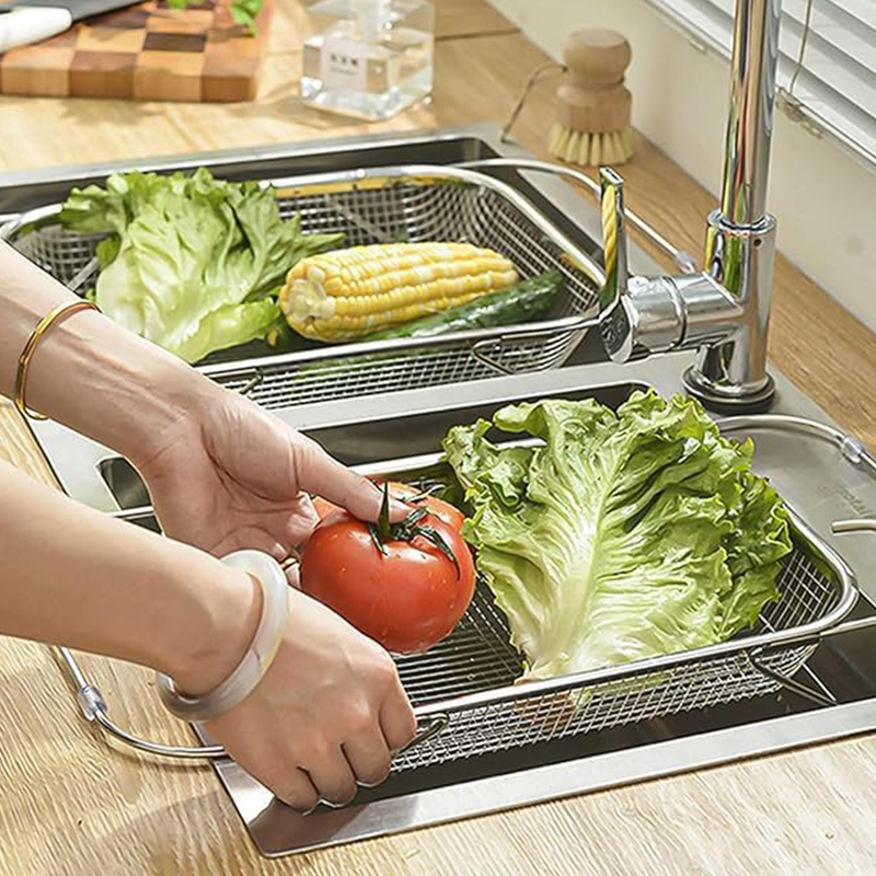 ADJUSTABLE FIT FOR VARIOUS SINKS: Features a telescopic dual-ear design that expands and contracts to fit different sink sizes. Equipped with non-slip silicone dots that securely grip sink surfaces, preventing movement during use and ensuring stability while washing or draining.
